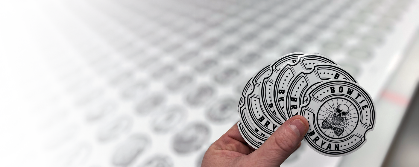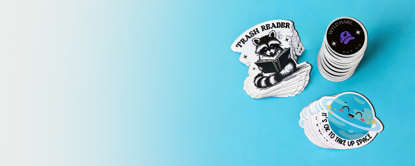 - Examples of vinyl, holographic, clear, and die-cut stickers.